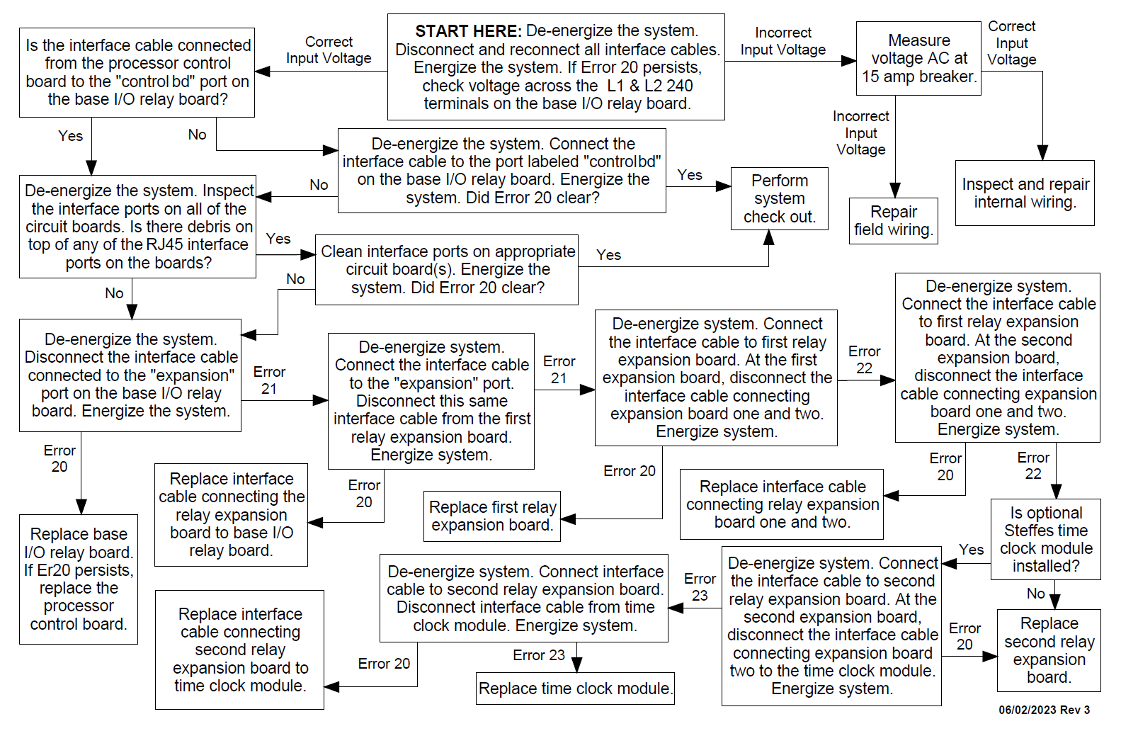 Error 20 occurs when there is a loss of communication from one circuit board to another. This may be caused by a loose connection of one of the interface cables, a defective interface cable, or a non-responsive circuit board. When troubleshooting Error 20, it is best to de-energize the Steffes heating system, disconnect and connect interface cables from the circuit boards one at a time, and then energize the heating system again. This will clear the Error 20 message if a loose connection was the cause. If the error message persists, examine the interface ports on each of the circuit boards for damage, corrosion, or debris.